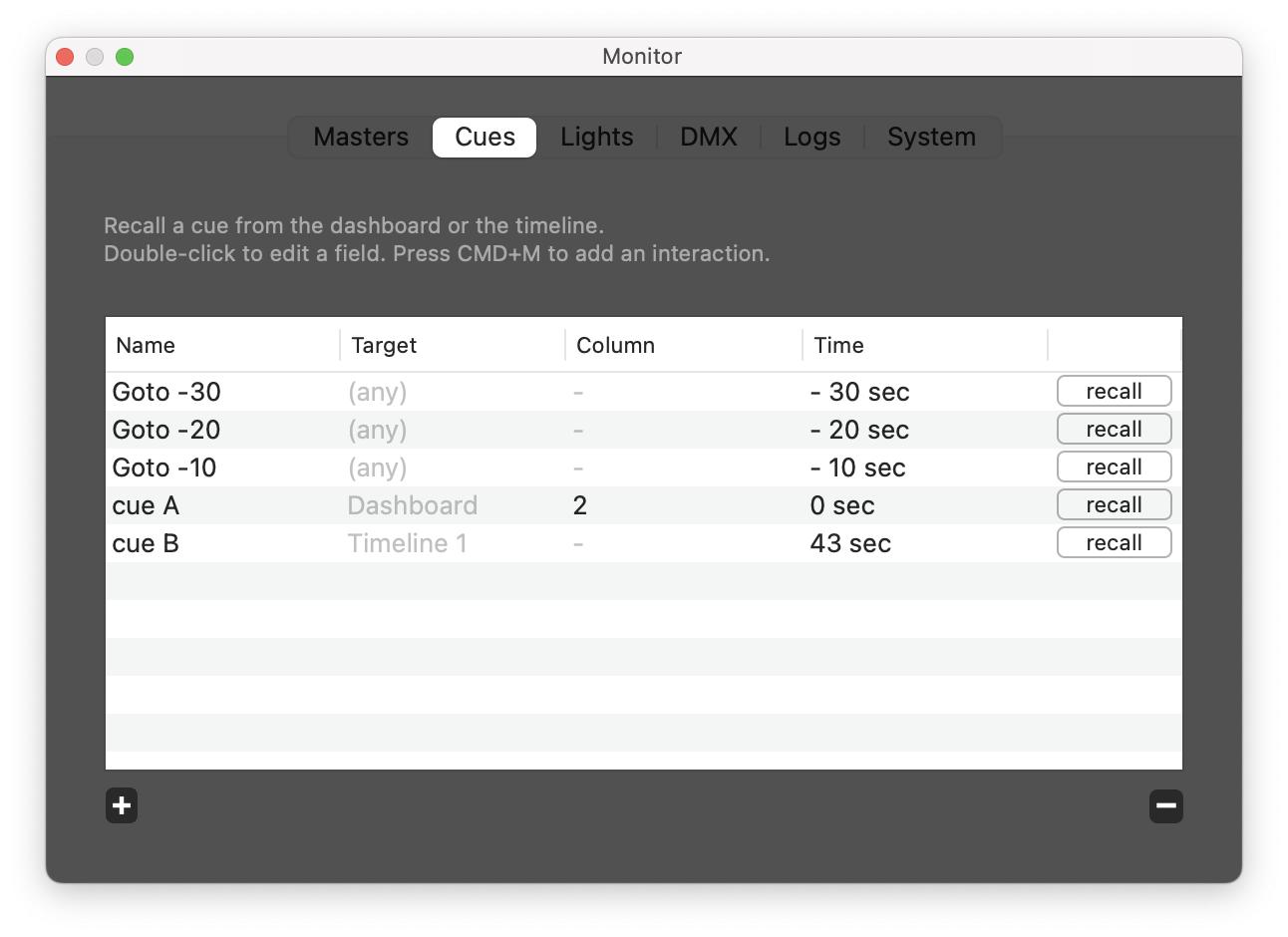 If needed, you can adjust the name, column or time. You can even use negative timing, so the cue starts from the end.