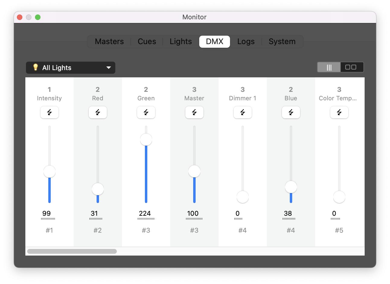Change the selection to focus on a particular DMX device, light, DMX-layer or choose all lights to show them all. Then you can move the sliders to send a different DMX value for each channel.
