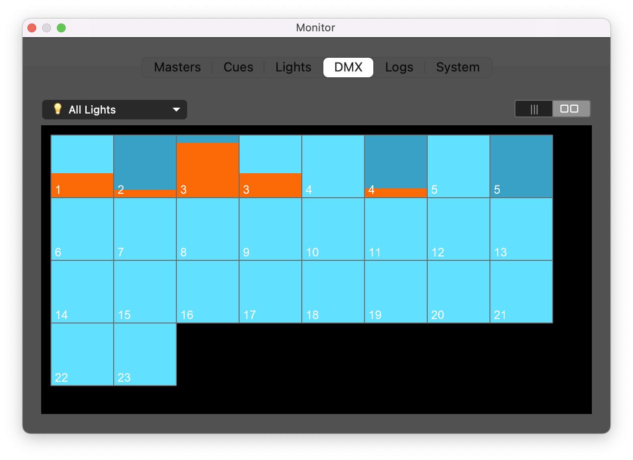 Sometimes, DMX data can be enormous. If so, click on the control in the top-right corner to display a more compressed view :