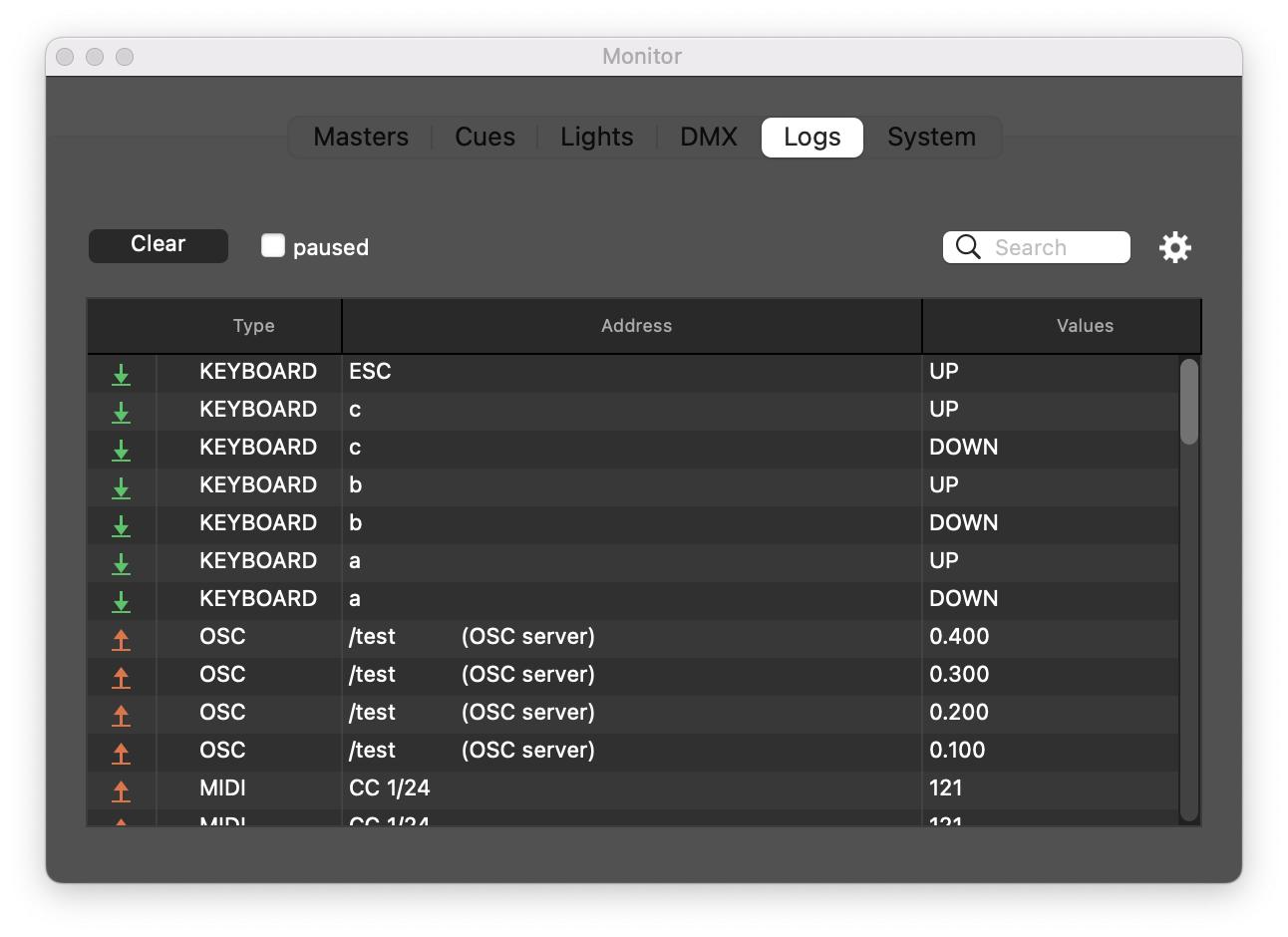 So it can be important to filter these result : use the search control to do so. The gear icon next to this control will show more option : in and out options to filter by input or output events, as well as a differential option to only show the value changes for each event.