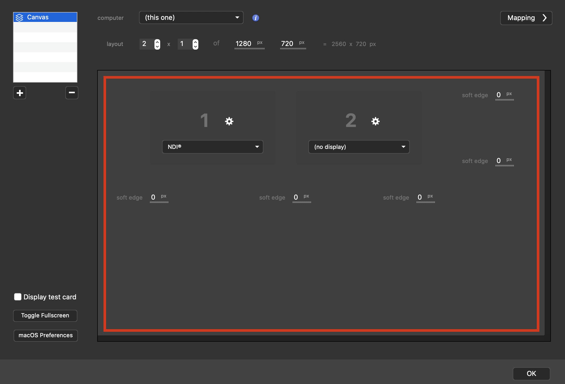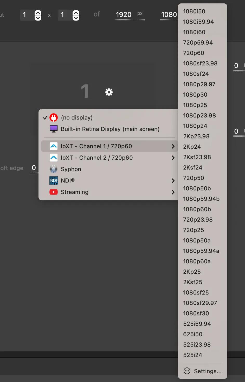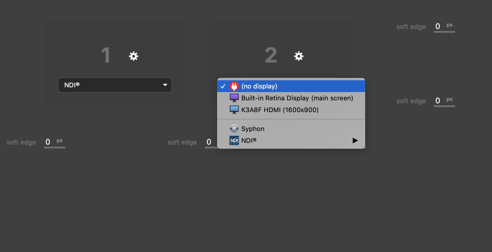 The displays recognized by your computer are listed first. These are exactly the same displays listed in macOS System Preferences / Displays, such as HDMI monitors, videoprojectors, LED screens or image-processors.
