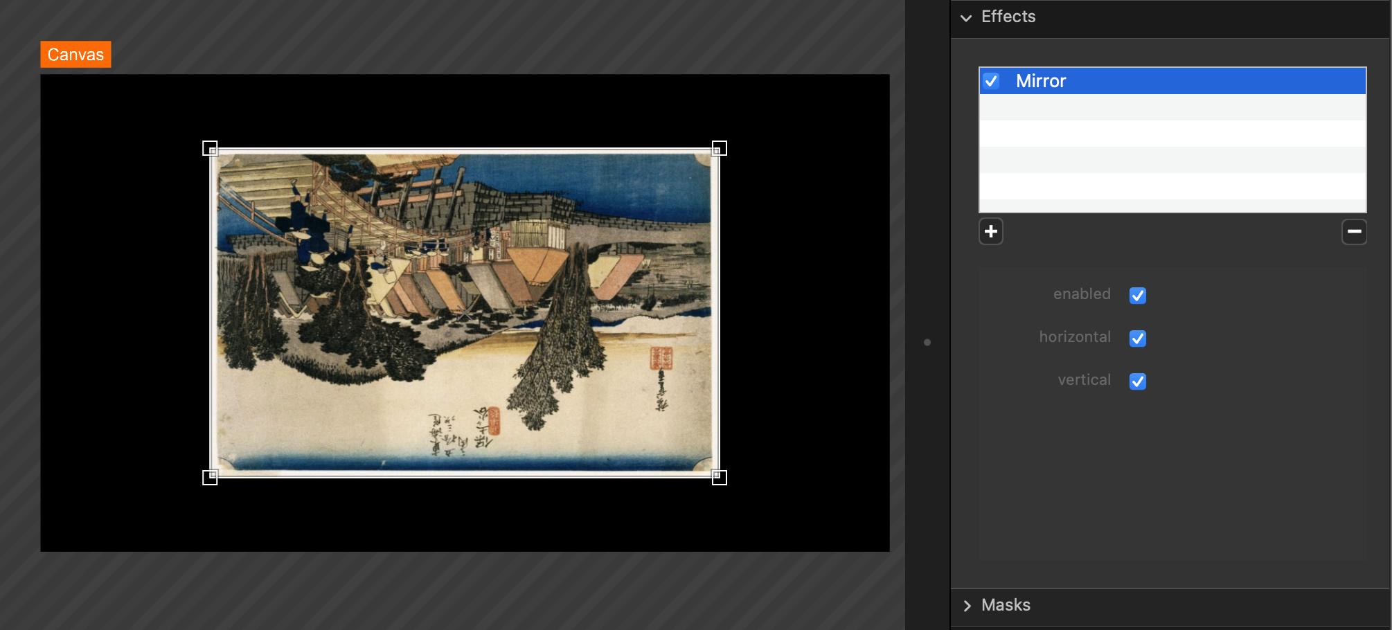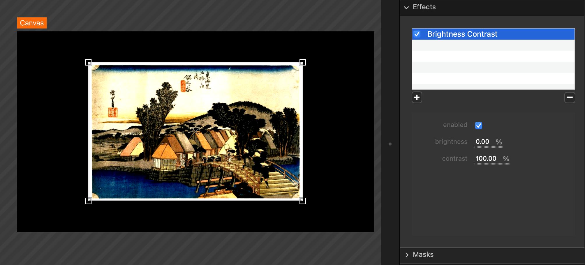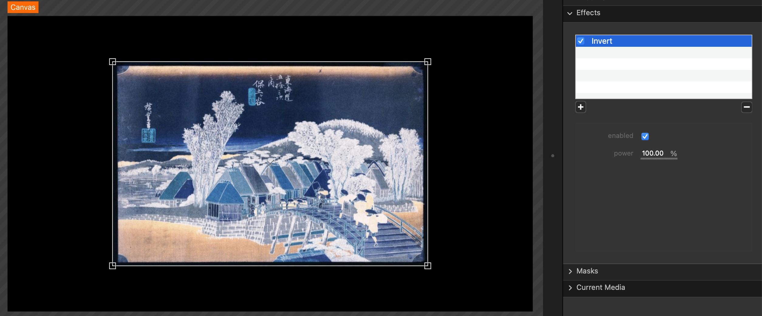 - the effects list : all the effects applied to the layer or the media by their compositing order. They can be reordered by drag-and-drop. Each effect can be disabled via the