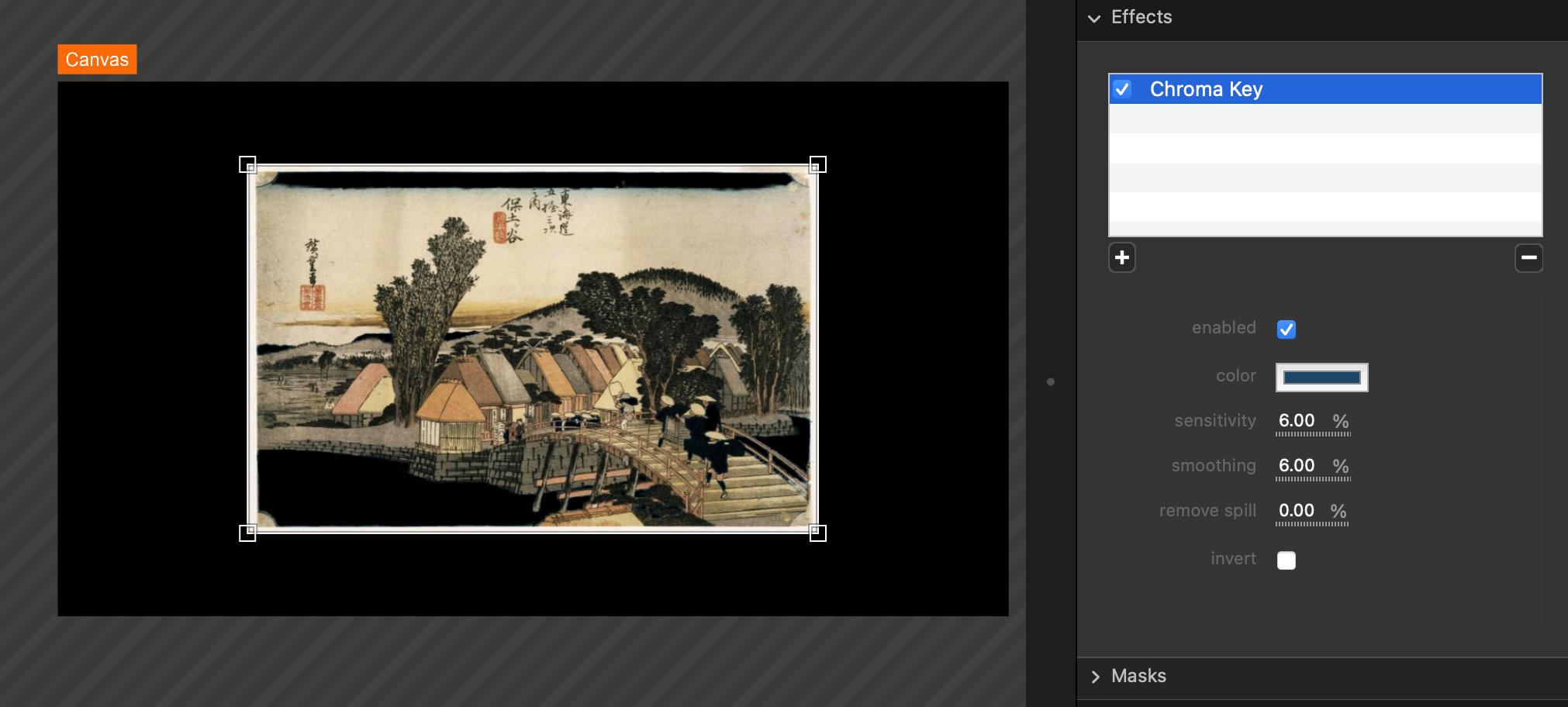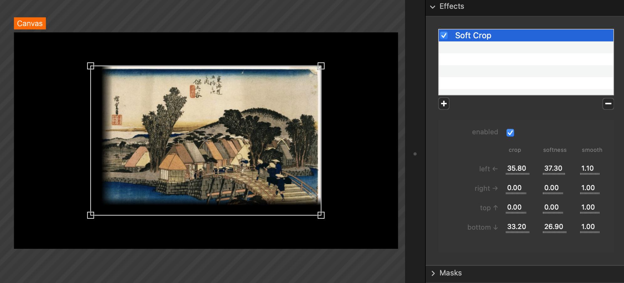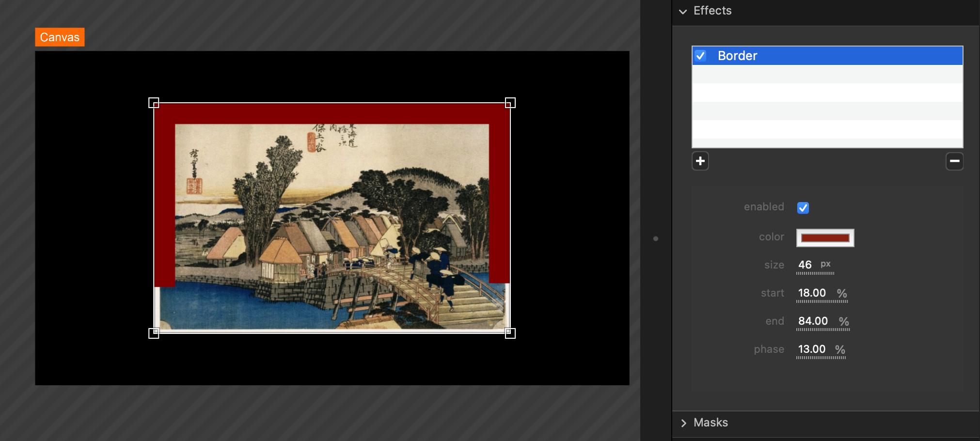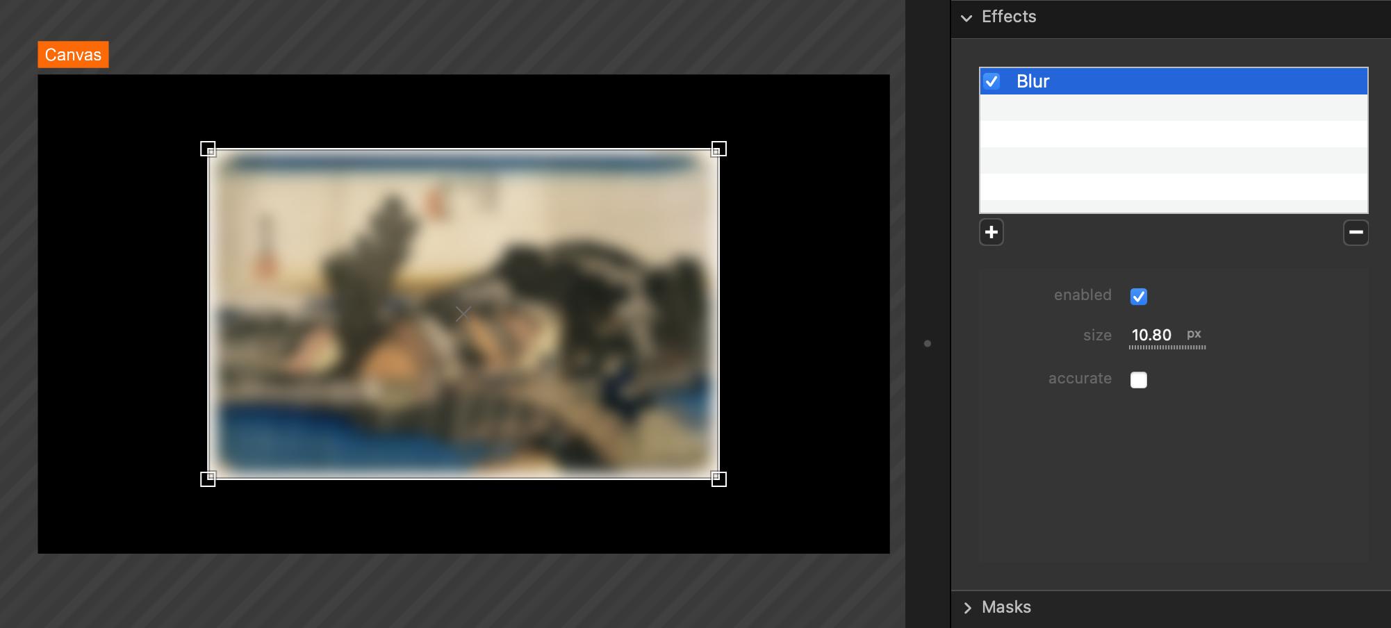 - the effects list : all the effects applied to the layer or the media by their compositing order. They can be reordered by drag-and-drop. Each effect can be disabled via the