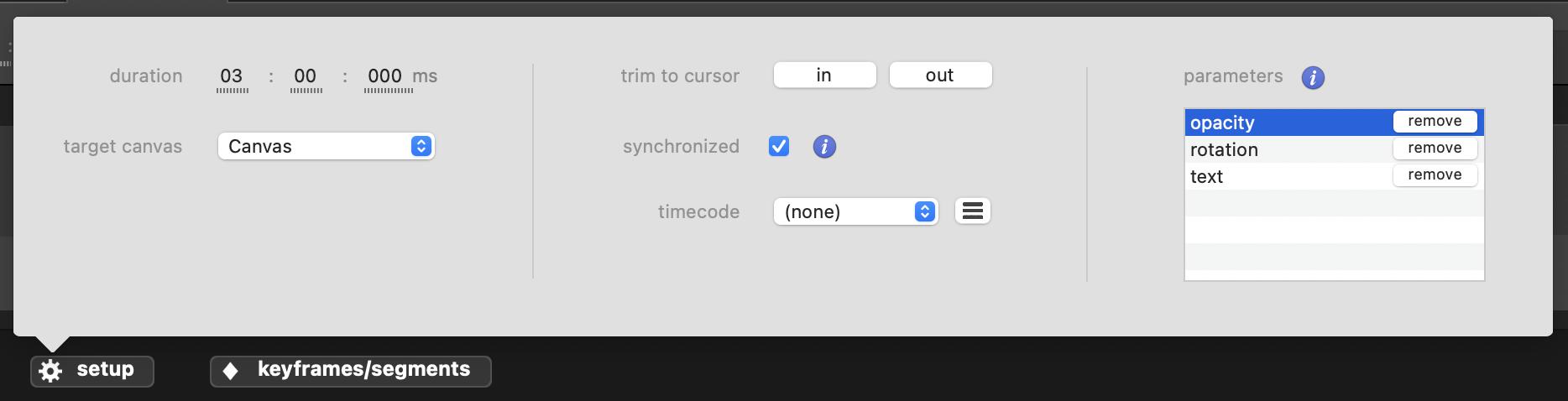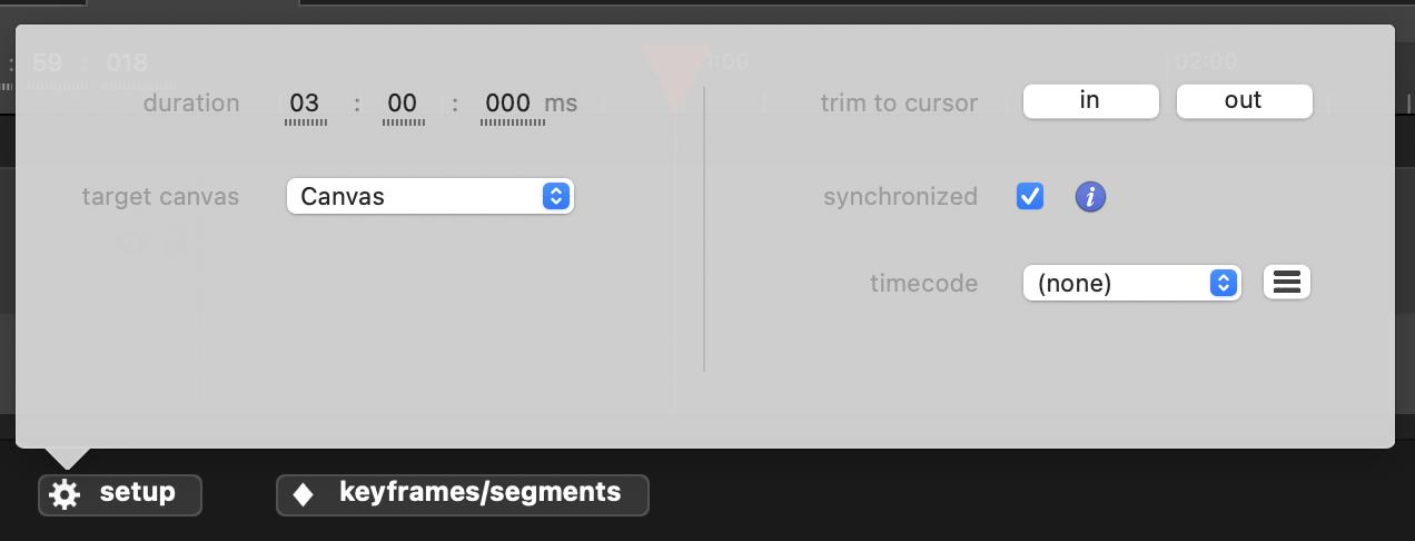 By default, a new timeline has a duration fo 3 minutes and targets the first canvas; change this by clicking the setup button :