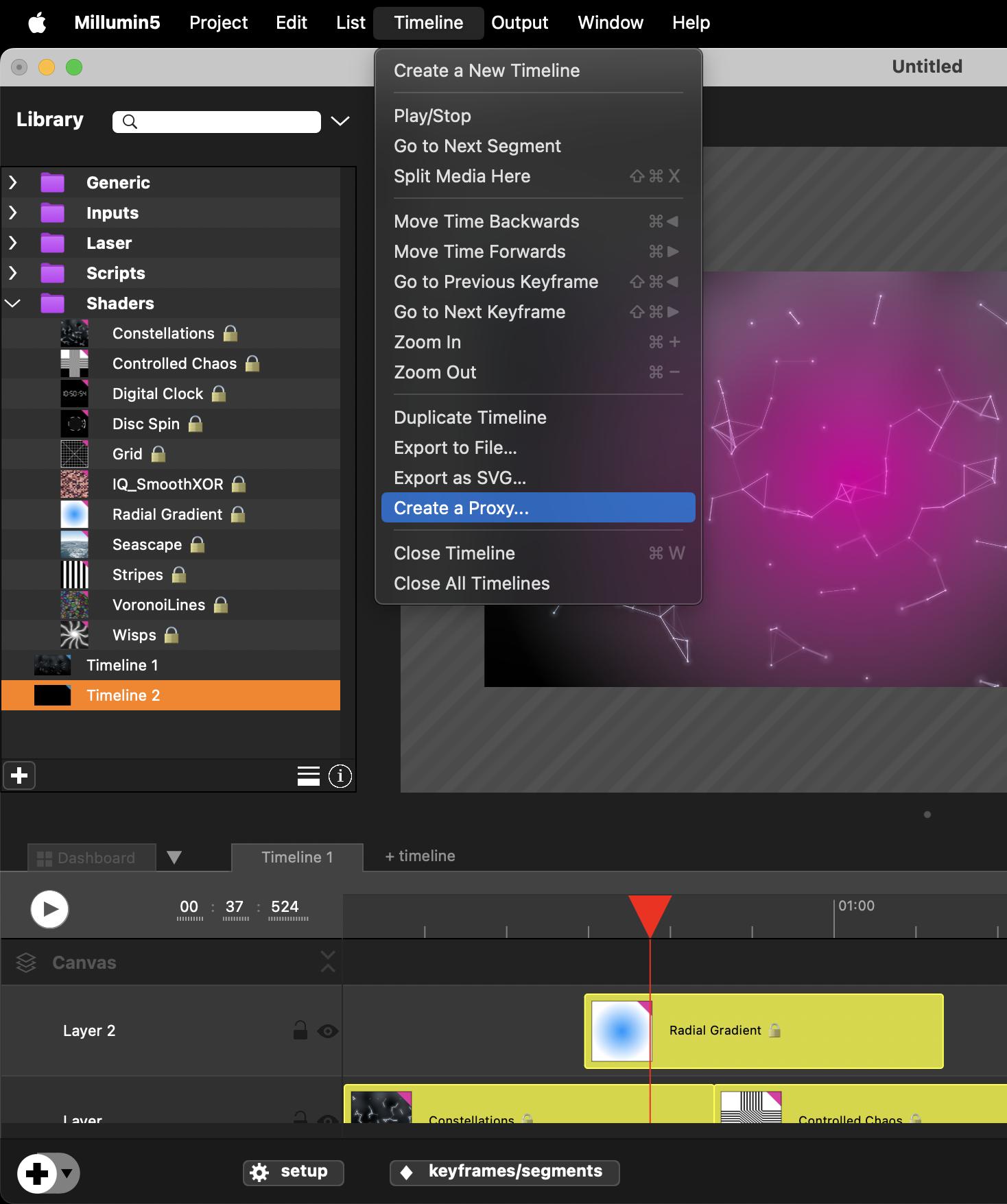 Lastly, from the Timeline menubar, select Create a Proxy... to convert your timeline into a pre-rendered file for performances purposes. Now, if you import this timeline in any other one or into a dashboard, Millumin will use the proxy file instead of rendering the whole timeline in realtime. Be careful however, if you modify your timeline after this operation, your proxy will be outdated, you will have to create a new one.