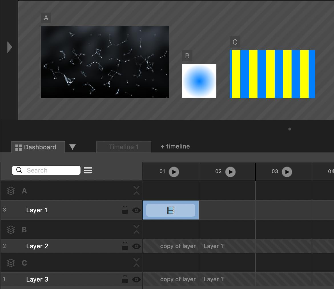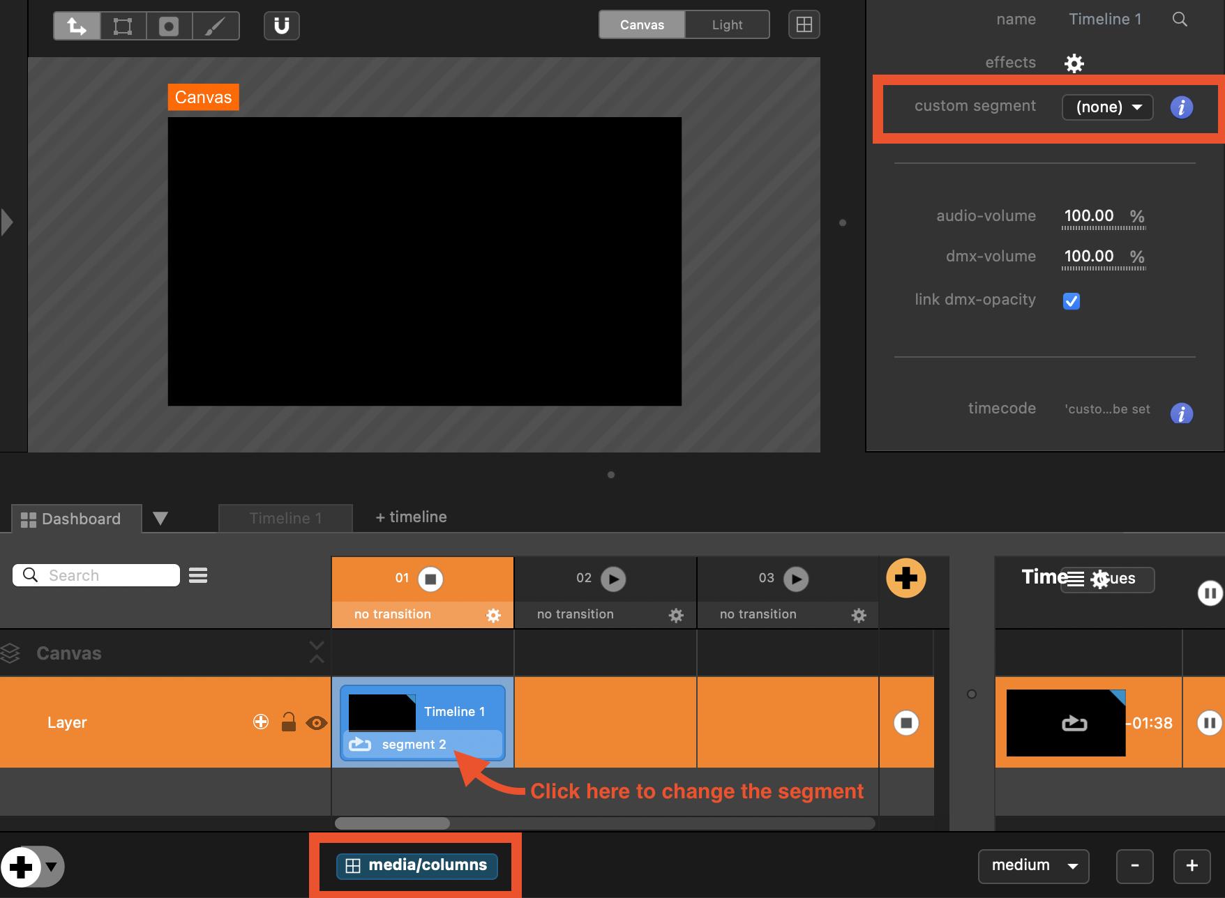 Millumin will automatically set a different segment on each column, so every time you launch a column, this will play this particular segment. Please note that the segment will follow the loop mode defined inside the timeline (loop or play-once).