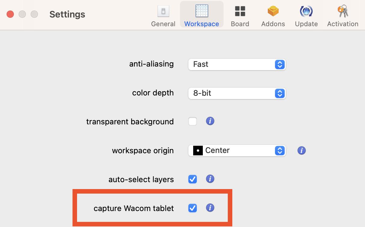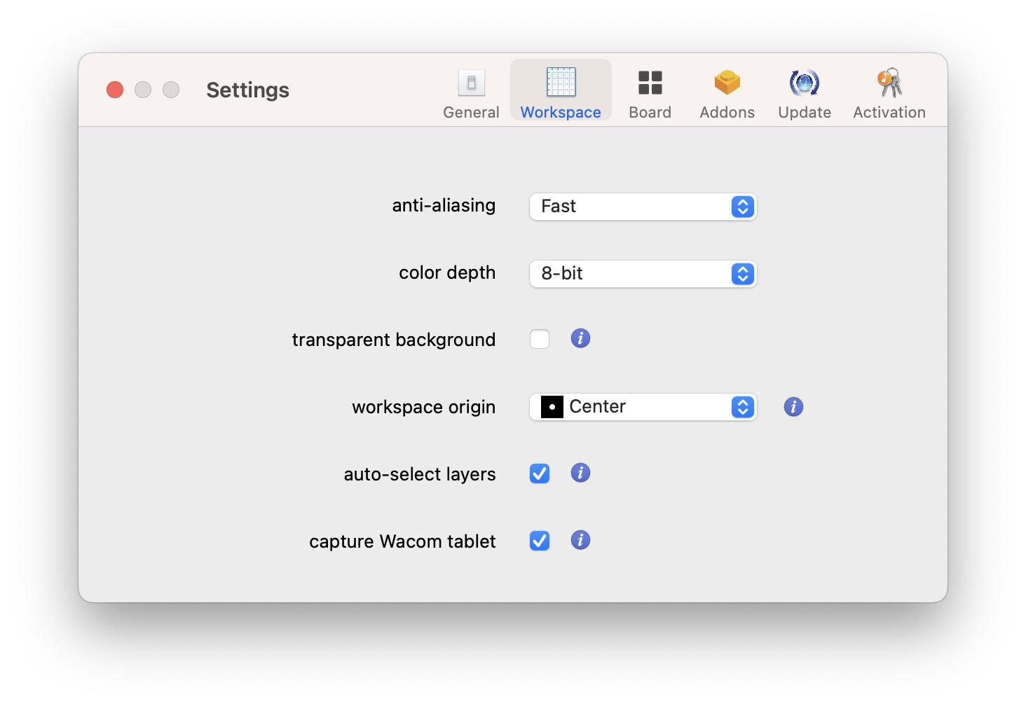 anti-aliasing: choose the quality of the anti-aliasing, to remove distortion artifacts. A better quality of anti-aliasing is at cost of performances.color depth: a better color depth allows to have more precise color, especially for gradients, but it requires more work for the graphic card. A 10Bit-HDR mode is also available to allow wide range movies or images to be decoded with their full brightness and contrast potential.transparent background: by default, canvas background is black. If this option is on, the background will be a checkerboard pattern, showing the transparency of the compositing.workspace origin: change the origin, the position of the (0,0) coordinate, in the workspace.auto-select layers: ask to display or not the border of layer when the mouse is above it. MaintainALTto invert this behaviour.capture Wacom tablet: if a Wacom tablet is connected to the computer, the brush-tool will capture and use its events.