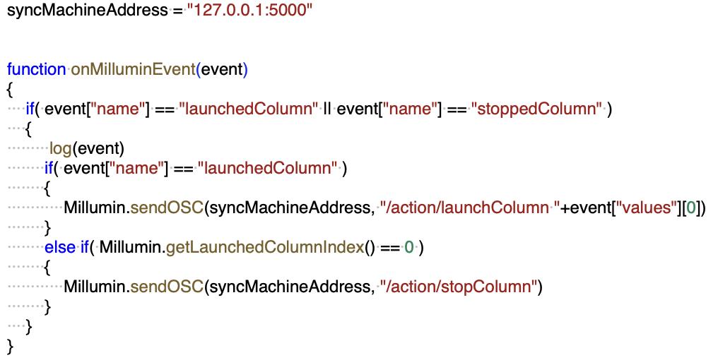 The scripts in Millumin can be quite powerful. You can especially find an example in Millumin’s library called ColumnSync that automatically sends OSC to a backup machine to be synced :