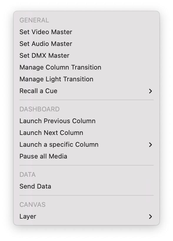 Each action has its own properties to be set up, and allows you to control numerous features of Millumin.