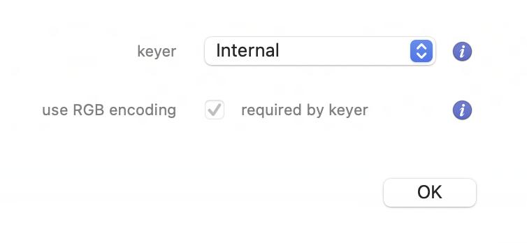 By default, Millumin uses the YUV 4:2:2 pixel-format to send the data to the Blackmagic card, but in some situation, you may want to prefer a full RGB pixel-format. Click on the settings item to activate this, as well as setting the keyer of your device if any :