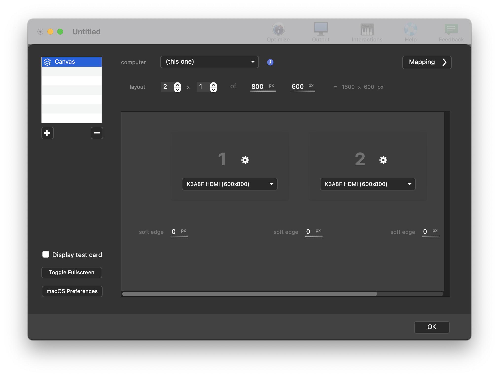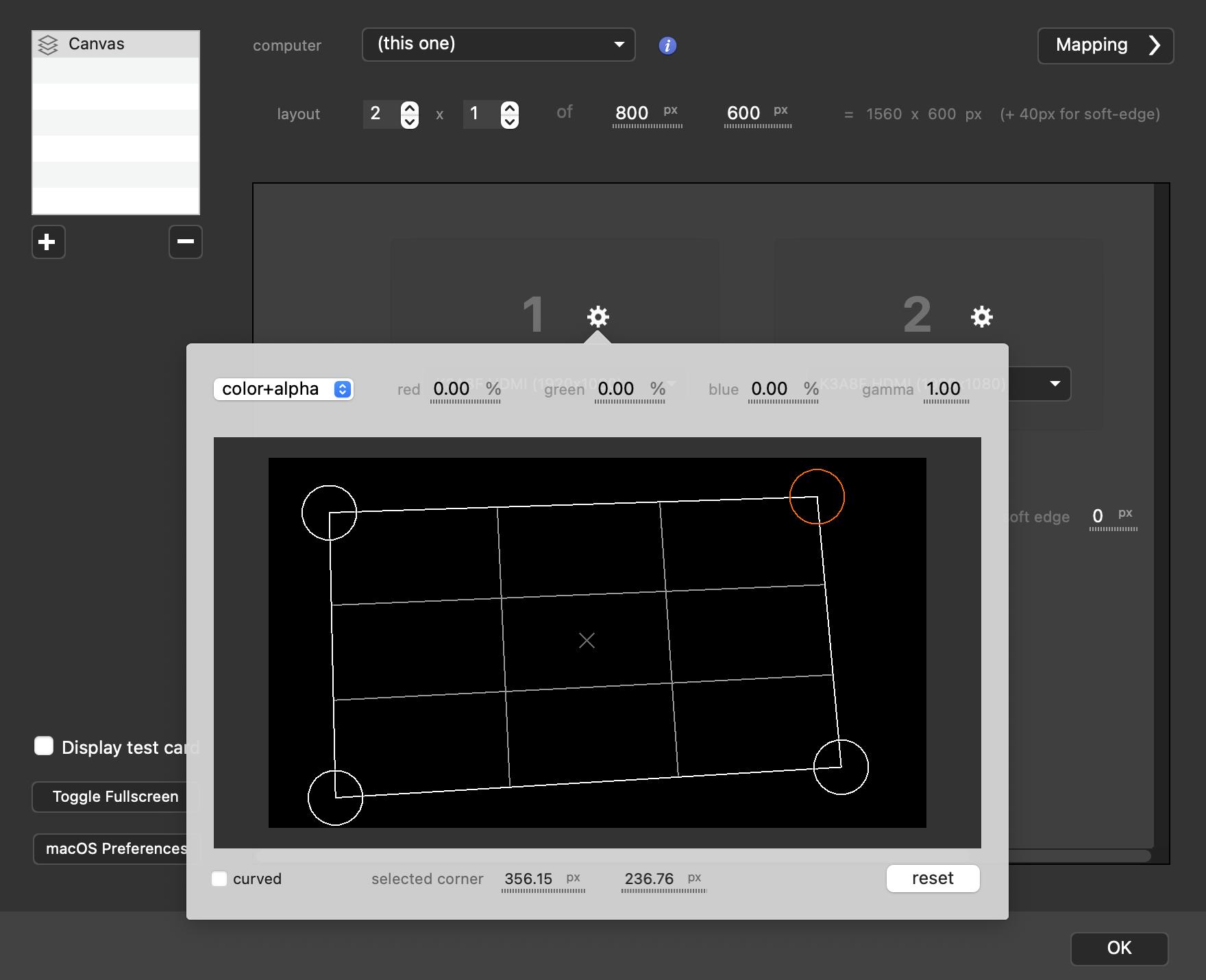 Click onDisplay test card, then adjust the mapping of both outputs so the circles and lines of the test-card are perfectly matching.