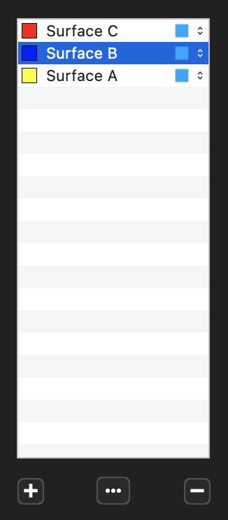 Use on the + and - buttons to add/remove surfaces. You can reorder surfaces by dragging-and-dropping them in the list. So a surface can be rendered above another one :