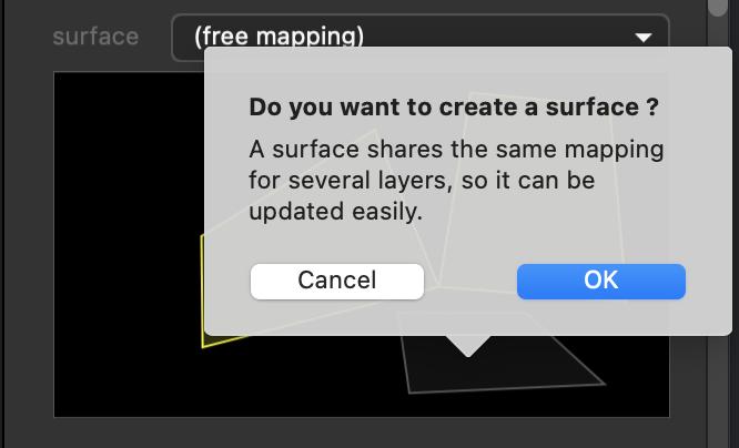 A surface is a mapping preset that can be shared between all the layers of a same canvas. Each layer of a canvas can be bind to a surface and its mapping will be updated according to the surface.