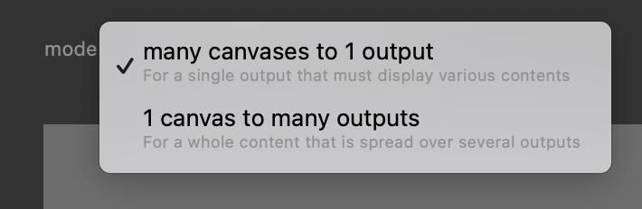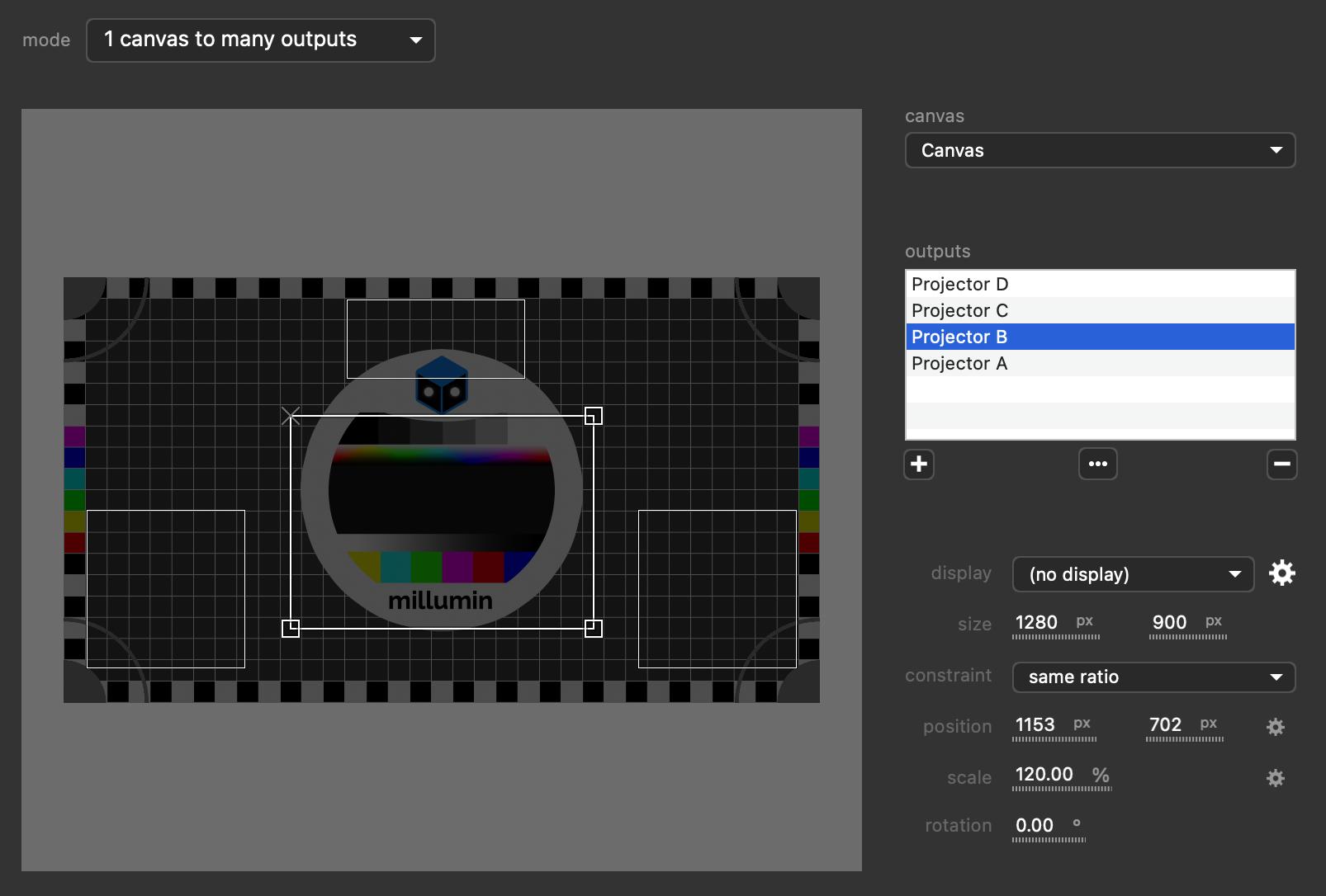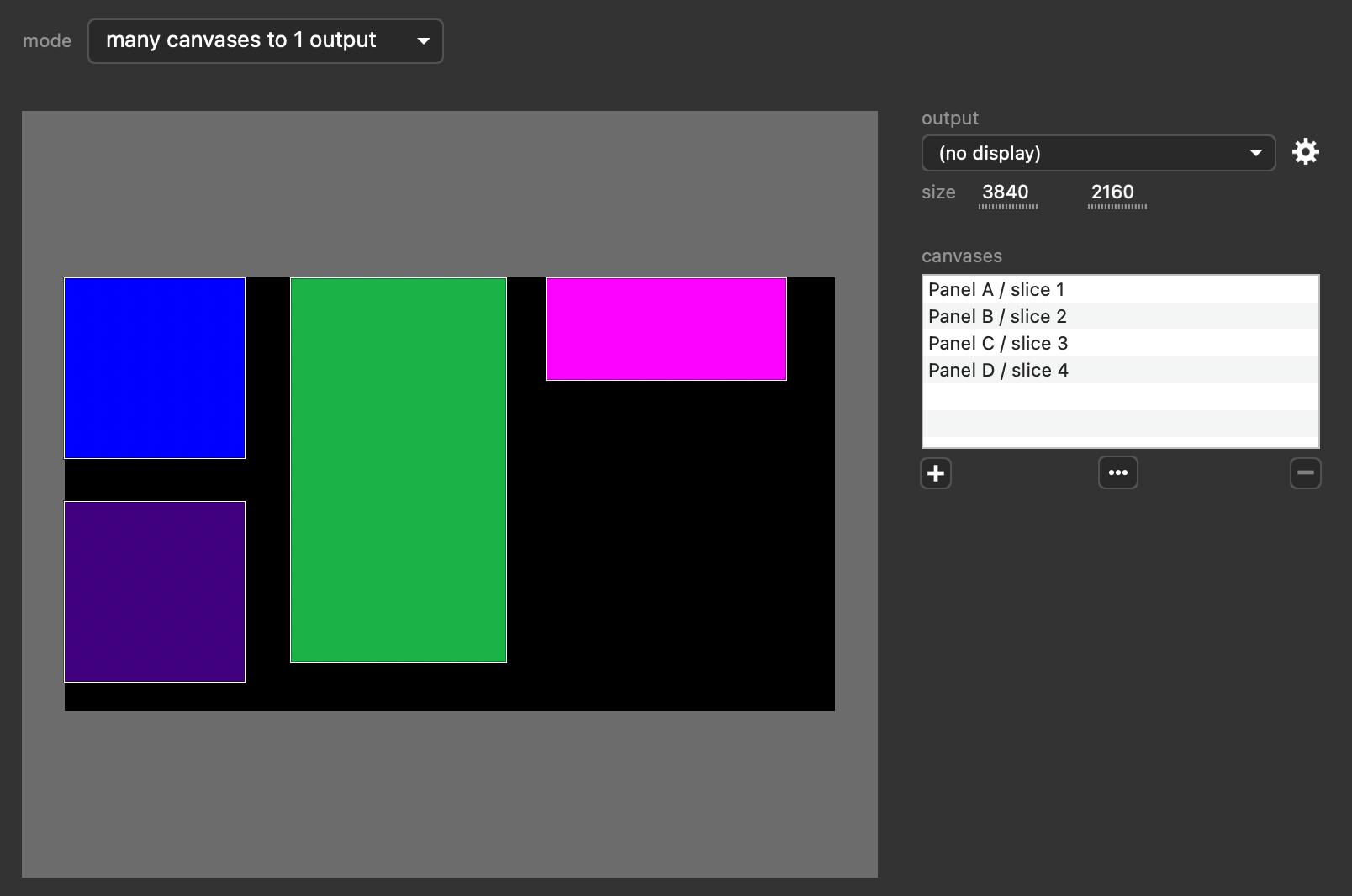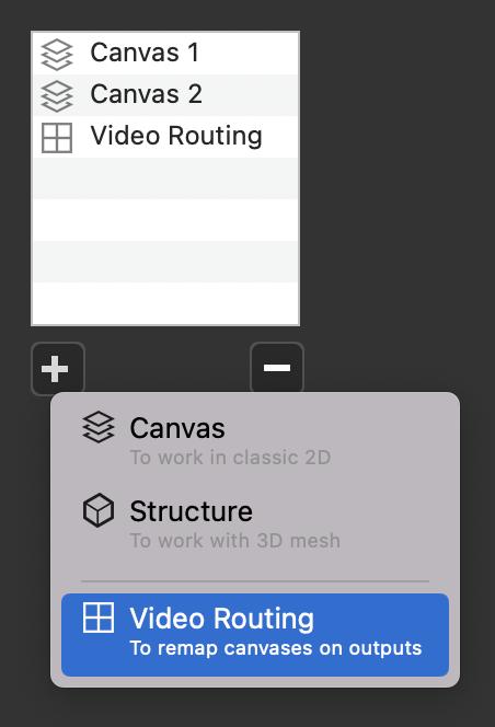 It uses one or more canvases, and map a portion or the whole image on one or more video outputs. Video-routings are not rendered in the workspace, so it also helps you to save space to edit your content.