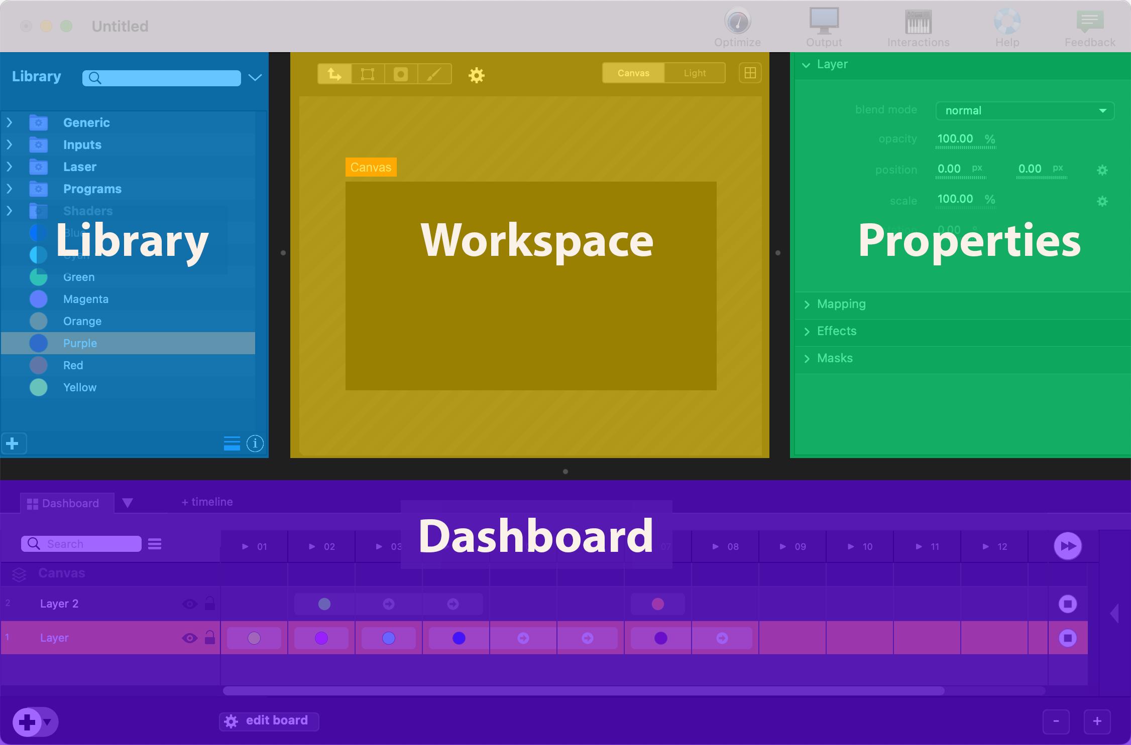 There are 4 main areas in Millumin’s window (that can be resized at your convenience) :