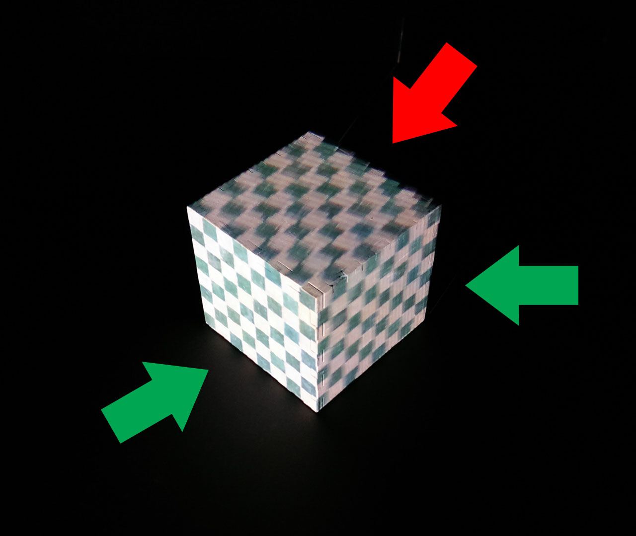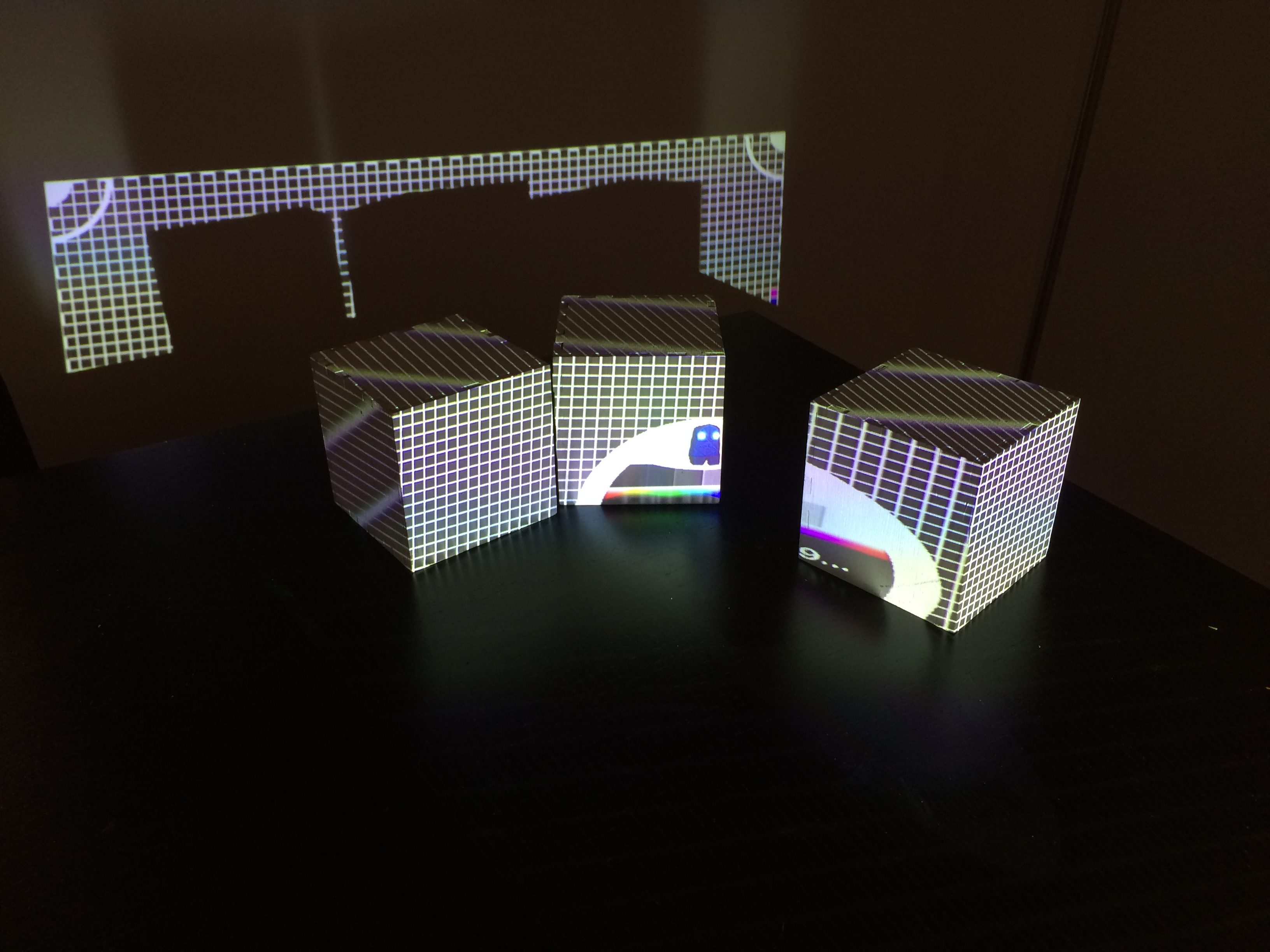 As you can see, the mapping on the top face is looking bad : this is because pixels are stretched there. Indeed, the video projector was not high/close enough to cover the top face correctly.