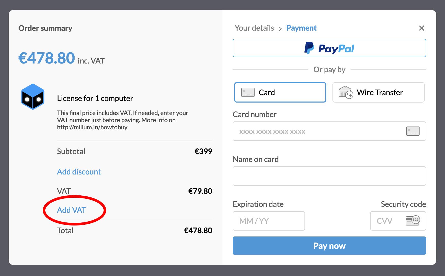 You can purchase such a license on the Millumin website. Payment is processed through e-commerce platform Paddle©. Most common methods are accepted : credit card, bank transfer, Paypal, GooglePay, ApplePay, …