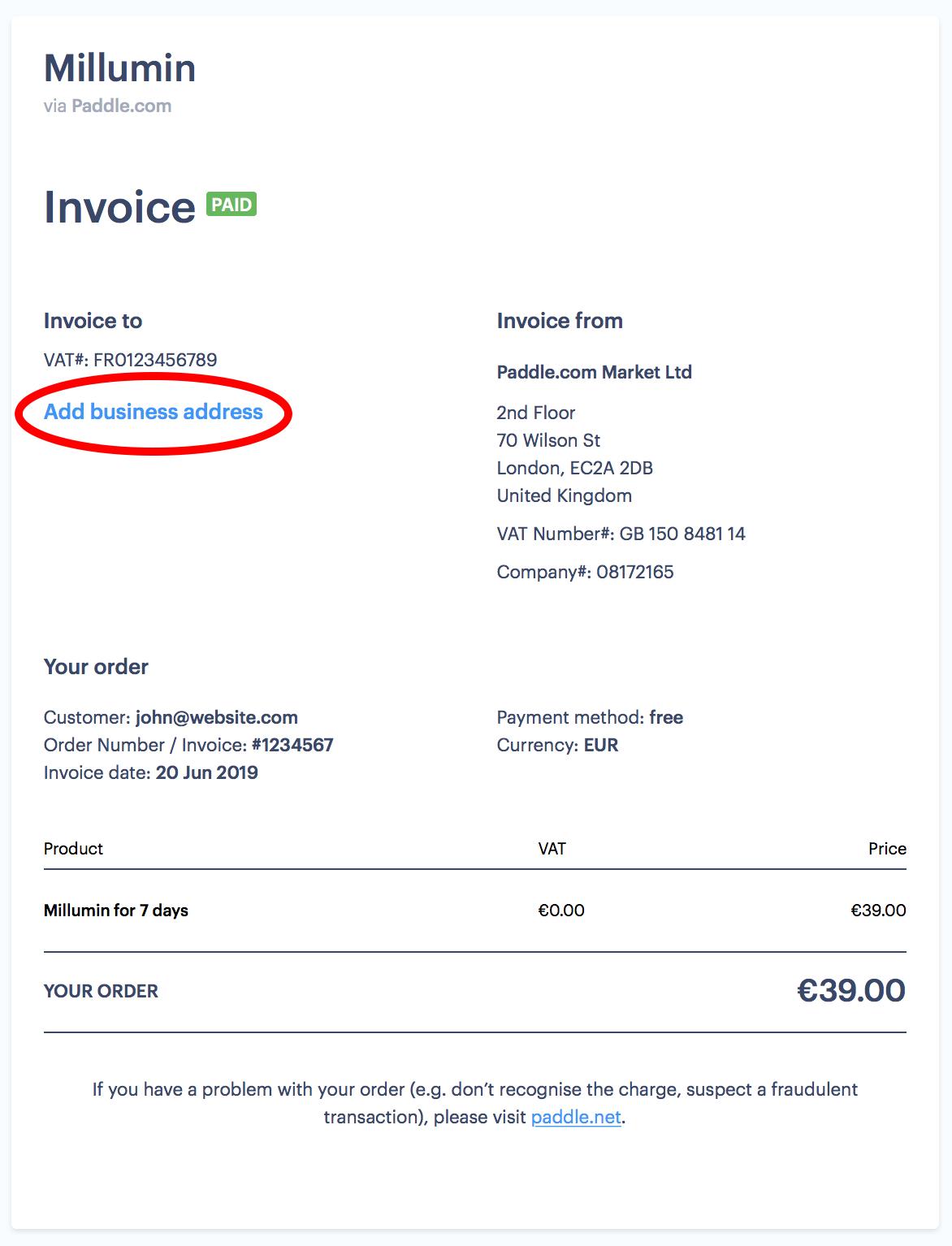 Then you can update your business address and your VAT number on the invoice, and the VAT will be automatically refunded :