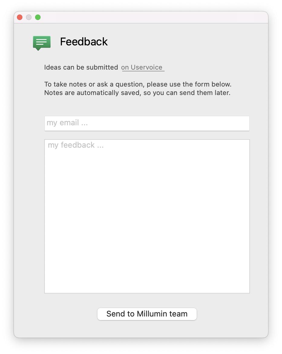 You can note your feedback directly in Millumin : simply click the “feedback” button on the top-right corner of Millumin’s window. The notes are automatically saved, so you can go on working then send us all your feedback at once.