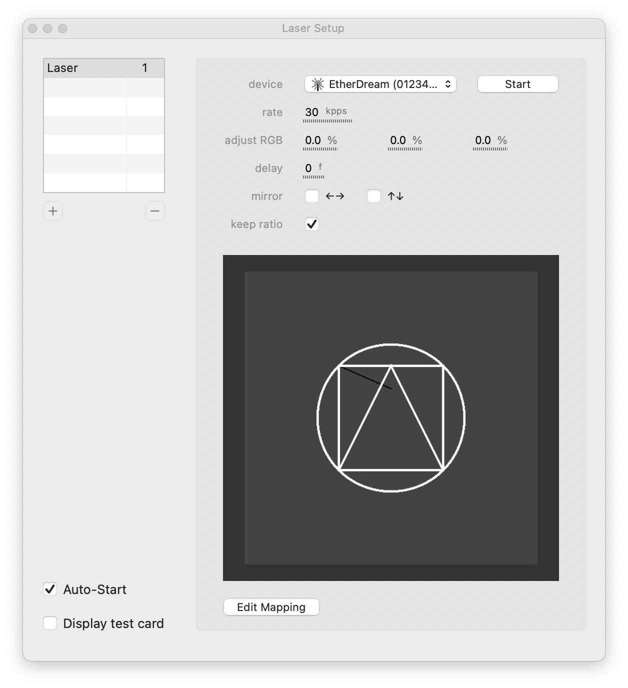 You can check Auto-Start to switch on your lasers at project startup. Be careful with this, lasers can be dangerous, make sure your installation is safe before activating this option.