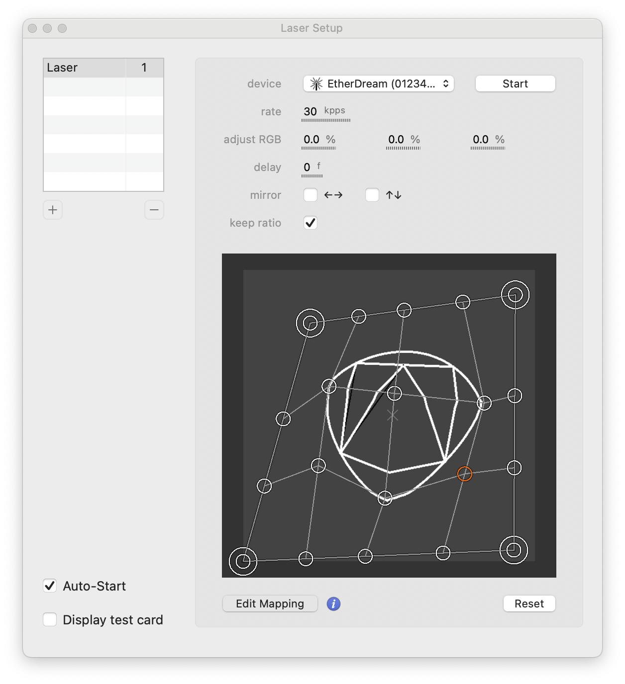 If you need to map or warp your laser ouput on a surface, you can click on Edit Mapping and the output mapping will be fully editable. Double click in the view to add warping points as shown below :