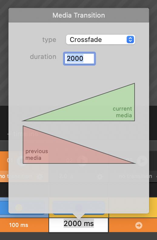 You can also change the type of transition (crossfade, fade-in-and-out or free) to adjust how the previous media fades out, and how the new media fades in.