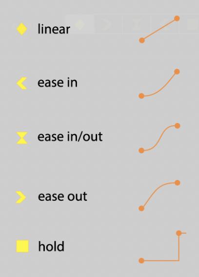 In the timeline, the animation principle is the same as with the board, but keyframes are used instead states. Indeed, keyframes also defines the values to interpolate between, but also the shape of the animation, called easing :