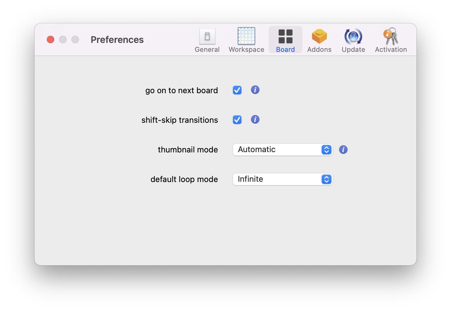 In the Board tab, you can especially set how the dashboard behaves when it reaches the end of a board, or allows to maintain SHIFT to skip transitions :