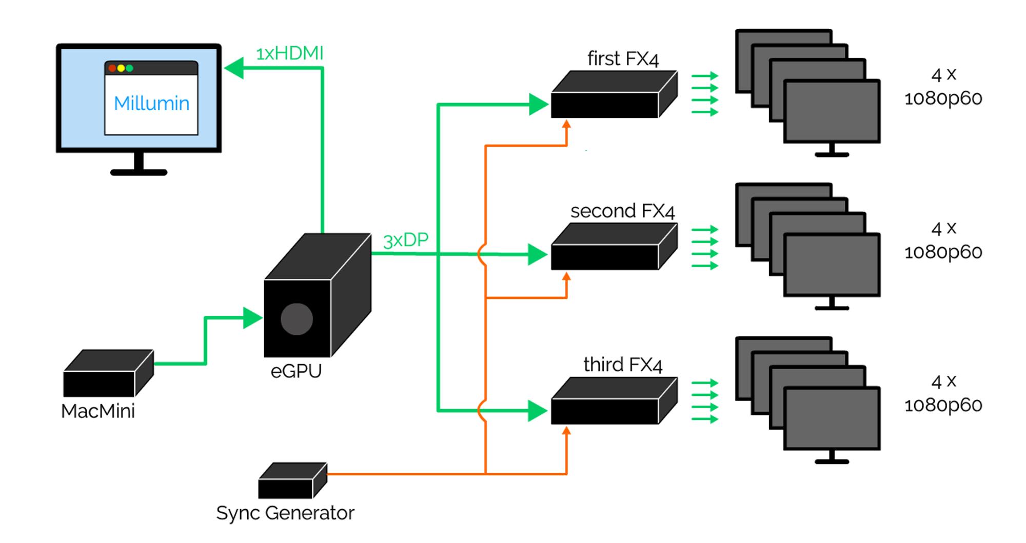 Each Fx4 will get the same signal to synchronize all their outputs together. See schema below with a MacMini 2018 + eGPU (more info about in this article : Recommendations ) :