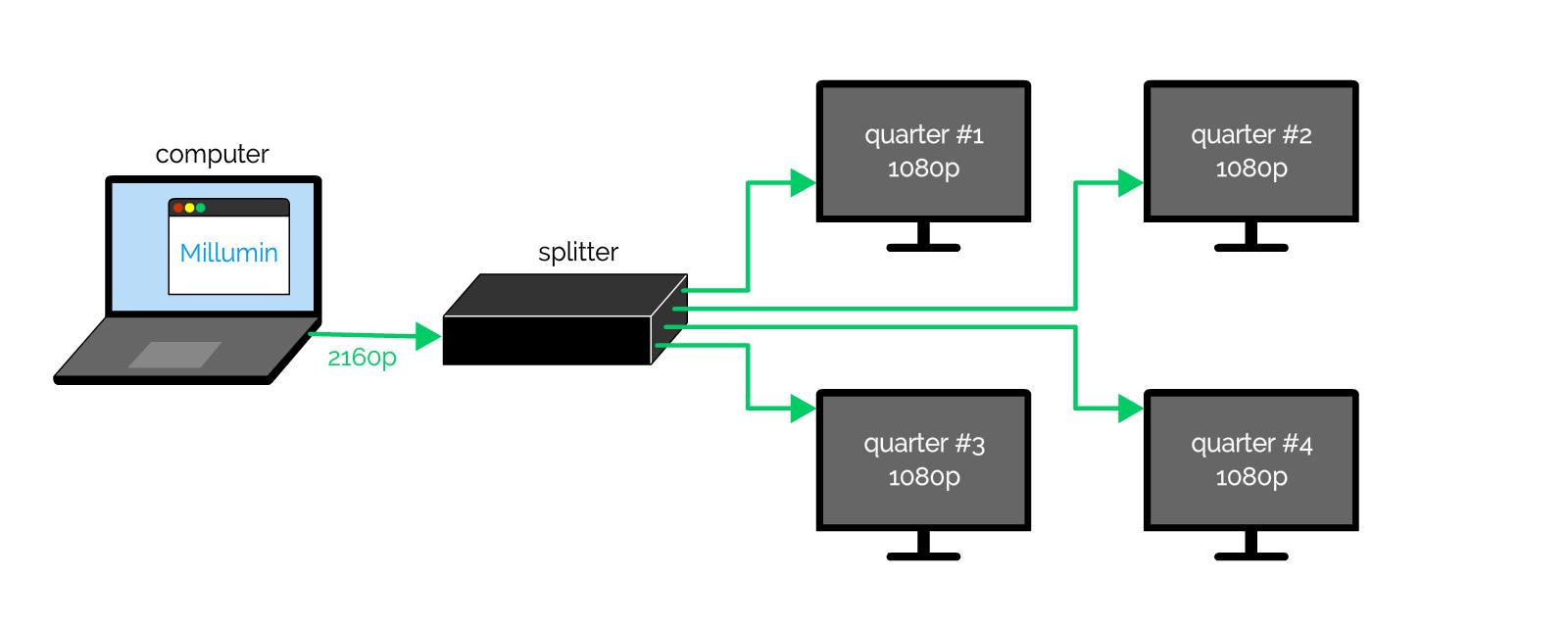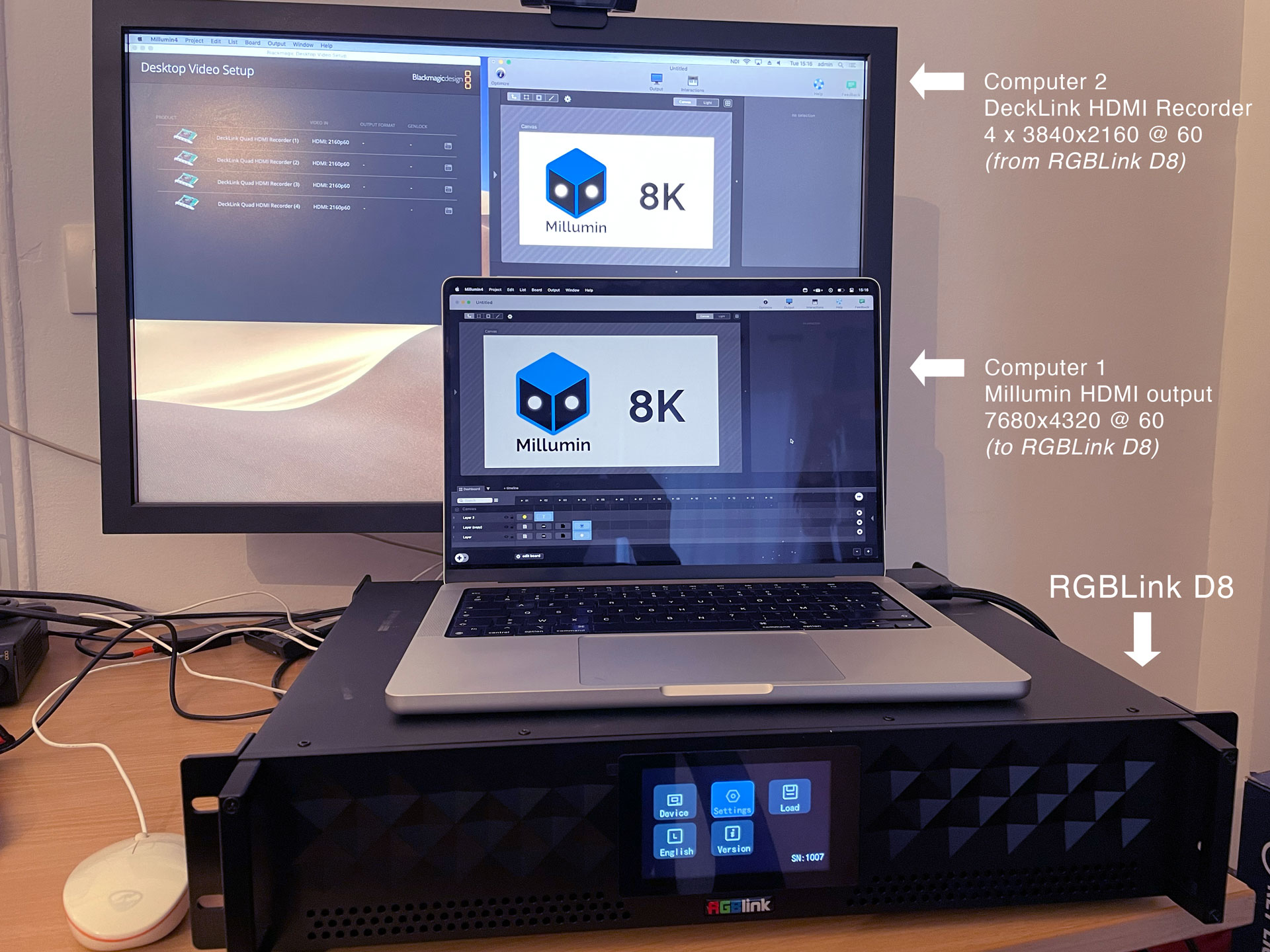 Nowadays, you can also use 8K wall controllers such as the RGBLink D8, the Great Prosperity 8K Wall Controller or the Astro HDMI 2.1 to 2.0x4 converter. Indeed, recent computers such as the MacBookPro M2 Max feature a HDMI 2.1 output, so suitable for a 7680x4320@60 signal.