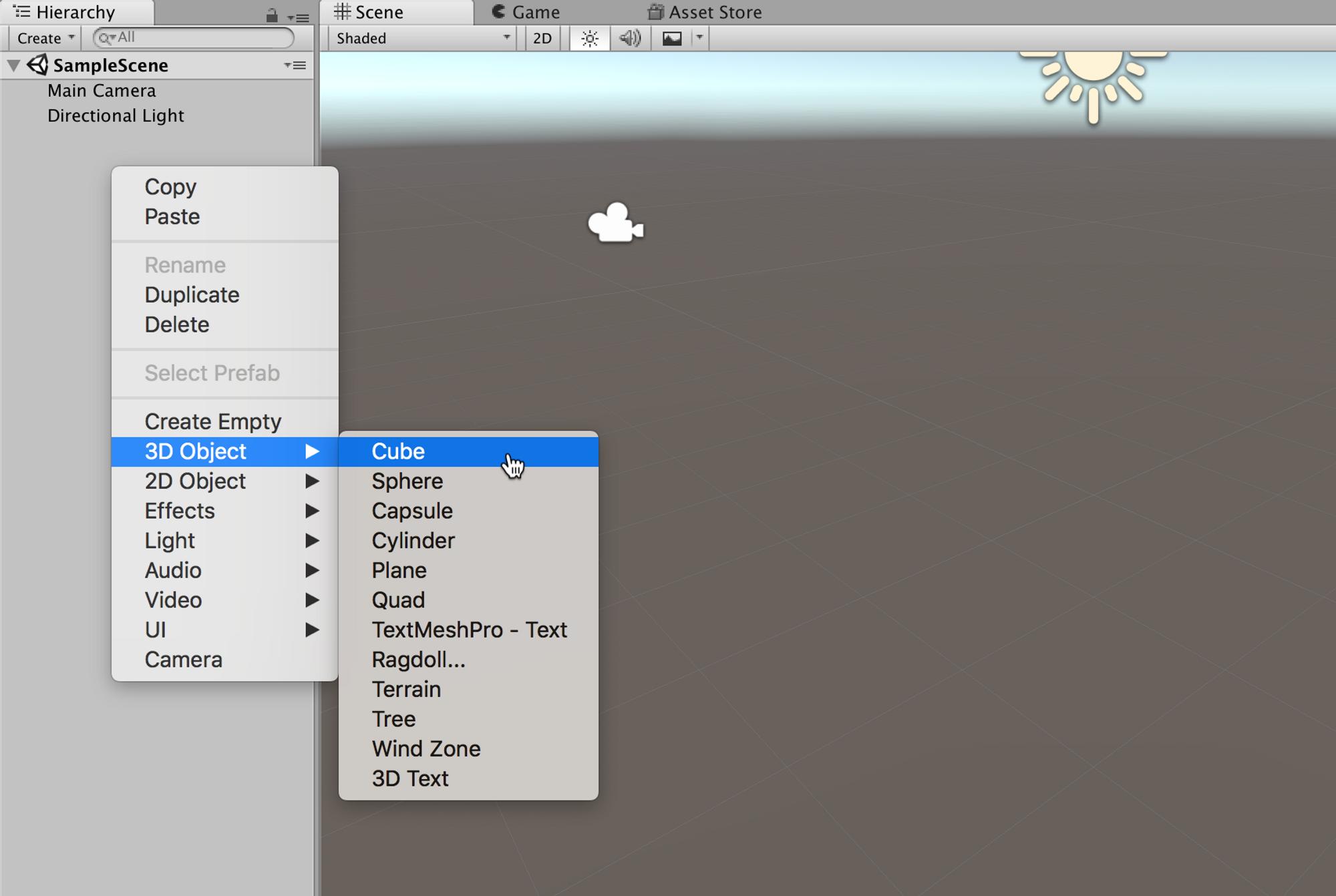 You should now have an empty scene with a Camera and a Directional light. Let's add a cube for our structure mapping (right-click inside the hierarchy view) :
