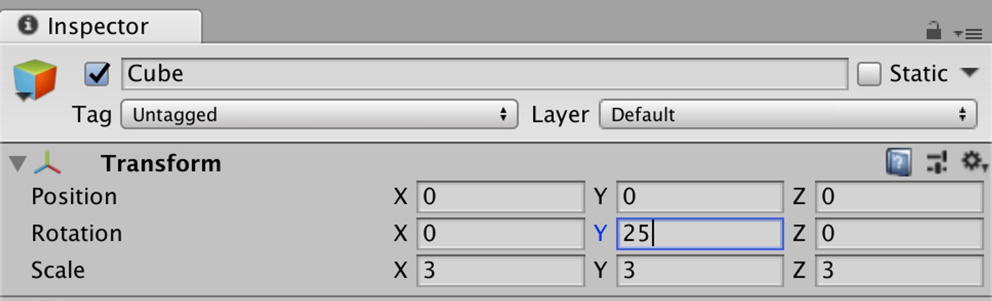 Select the cube element and go inside the inspector view. Scale its different axis to 3 and rotate it 25° along the Y axis :