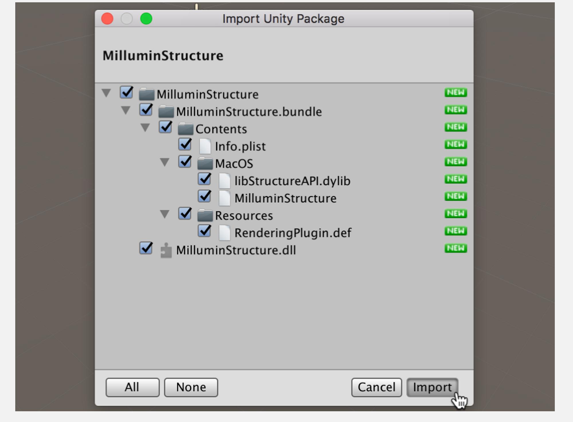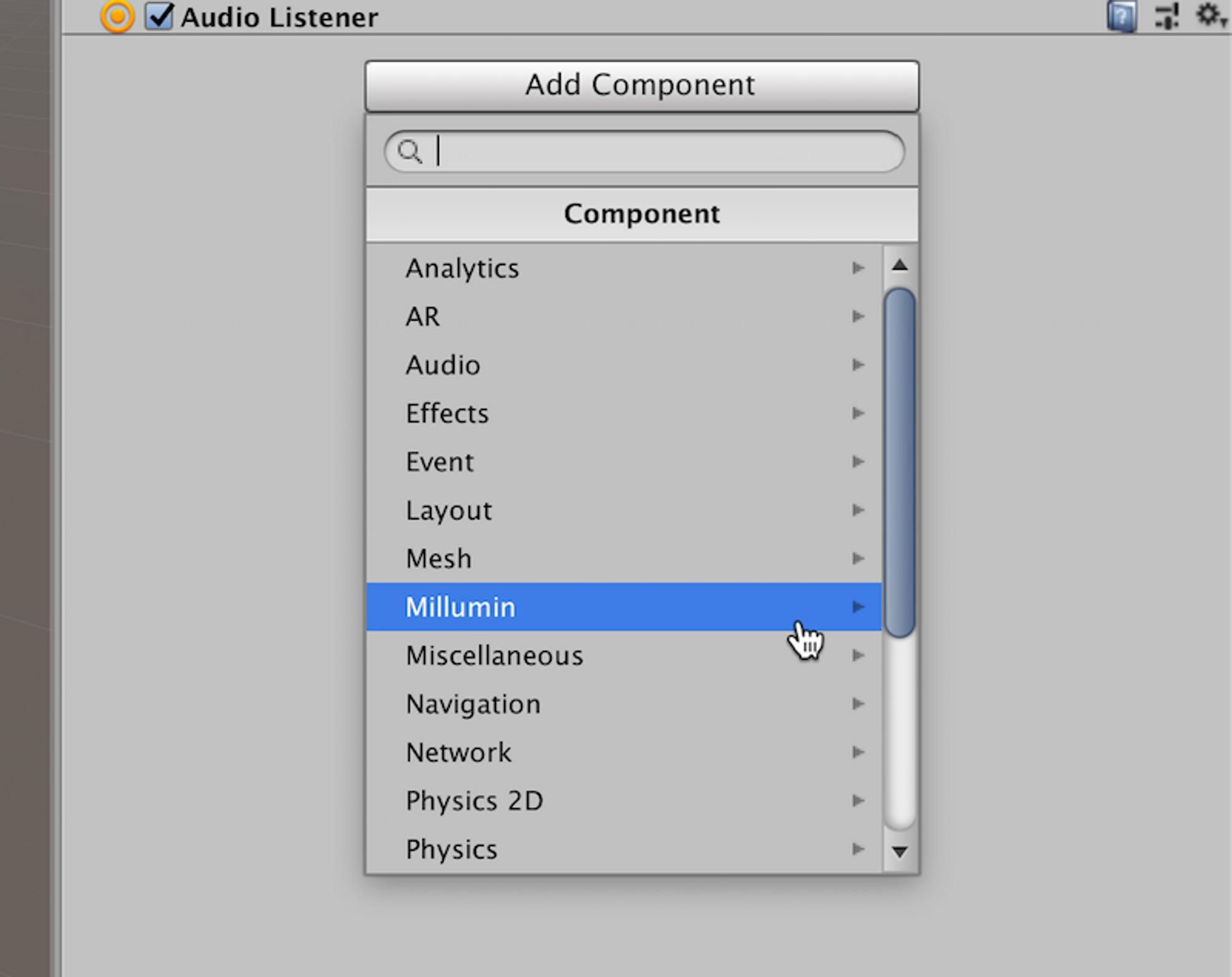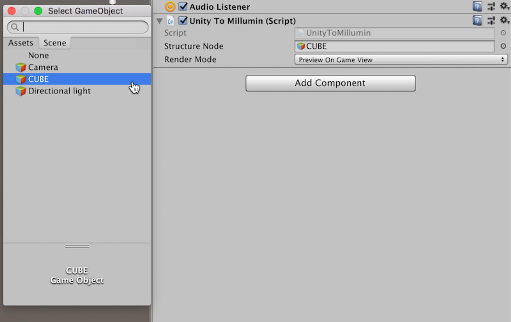 Select your camera then add the Structure component from the Millumin option. Depending on your configuration, the plugin might ask you to change a few project settings. If so, follow the instructions and continue :