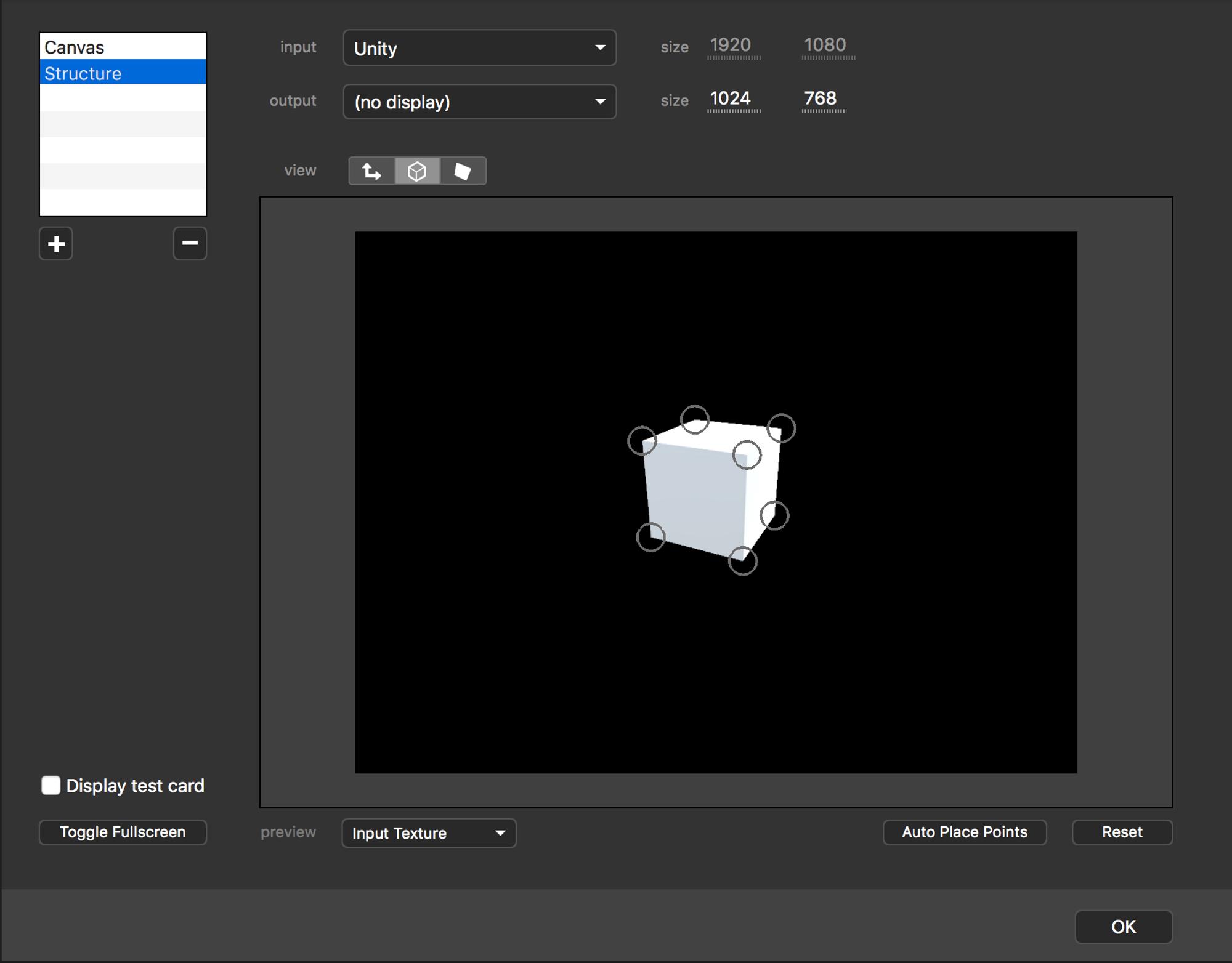 The setup is done. Push the play button and open Millumin. Go to the output Menu, add a structure using the + button and select Unity as input.